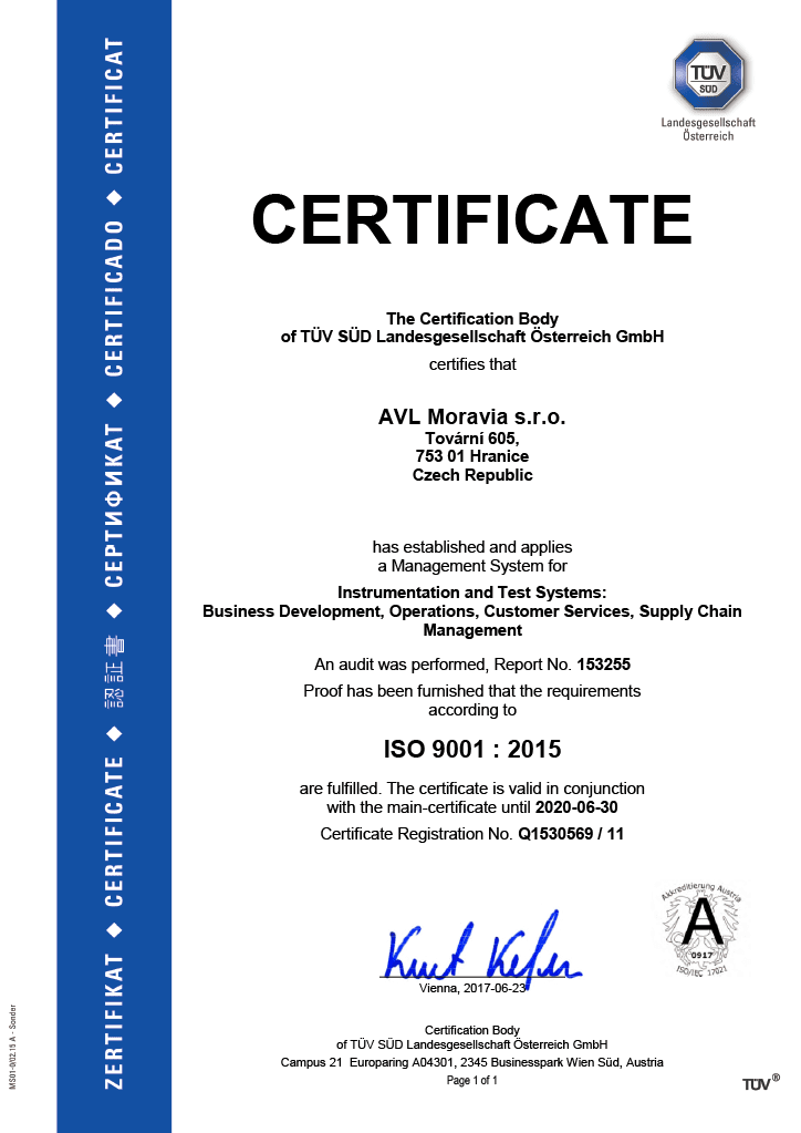 Firma AVL Moravia s.r.o. je certifikována podle mezinárodní normy pro systém managementu kvality ISO 9001 v oblasti prodej, vývoj, výroba a služby zákazníkům pro vybavení na testování motorových vozidel a spalovacích motorů, jako jsou dynamometry pro motory, podvozky a jejich komponenty. Certifikace podle normy je doložena certifikátem od akreditované organizace a způsobilost k certifikaci je ověřována jednou ročně formou externího auditu.